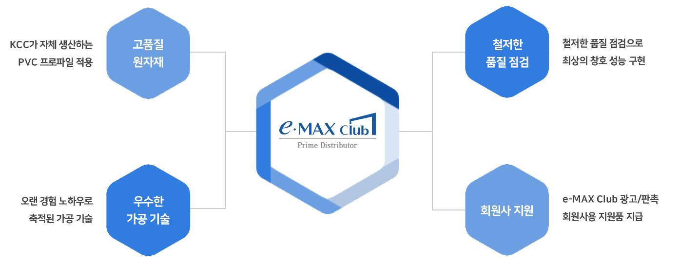 KCC e-MAX Club Prime Distributor는 최고의 품질과 최상의 서비스를 공급하기 위해 엄격한 품질관리 기준을 만족하는 유통시장 전문 KCC 창호 가공 네트워크입니다.